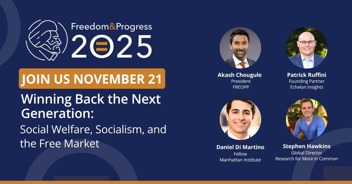 We hope to see you in D.C. later this month! Want to talk about these ideas and more with others who believe in the American Dream and want to ensure that it endures? Join us at our annual Freedom & Progress Conference on November 21, 2025, at the Conrad Hotel in Washington, D.C., to tackle the hard questions: where critics are right about what’s broken—and how freedom-based solutions can fix it. It’s not too late to register—simply visit the conference page at FREOPP.org to view the latest agenda and to sign up.